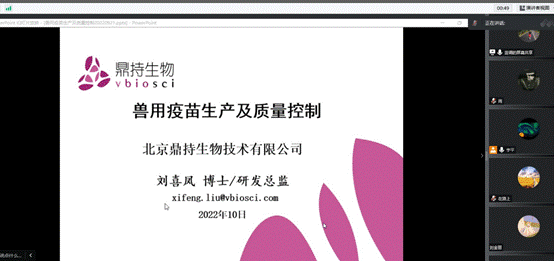 第六场报告专家是行业专家刘喜凤博士、总监,刘喜凤博士首先介绍了北京鼎持生物技术有限公司疫苗研发简况,特别讲解了兽用疫苗生产及质量控制等研究工作及其心得体会。