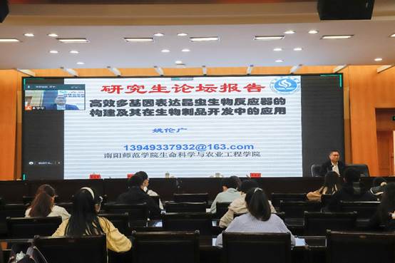 第一场报告专家是生命科学与农业工程学院长院姚伦广,姚伦广院长首先介绍了高效多基因表达昆虫生物反应器的构建及其在生物制品开发中的应用,特别讲解了昆虫生物反应器研究中一些“反常”的实验现象,勉励学生:实践出真知,要知行合一,受到学生热烈反响。