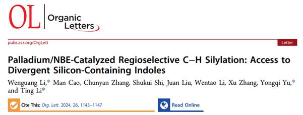 有机硅化合物由于其独特的化学和生物活性,在有机转化、功能材料和药物化学中有着广泛的应用。本研究发展了一种新颖的钯/降冰片烯催化下游离N-H吲哚的区域选择性C−H硅基化反应。该反应具有官能团耐受性好、底物范围广泛、操作简单、对环境友好等优点,此研究为有机硅化合物的合成提供了新的策略。该成果发表于中科院SCI大类一区、自然指数期刊Organic Letters,李文广博士为第一兼通讯作者,于永齐博士和李亭教授为共同通讯作者,8803威尼斯检查中心为唯一通讯单位。