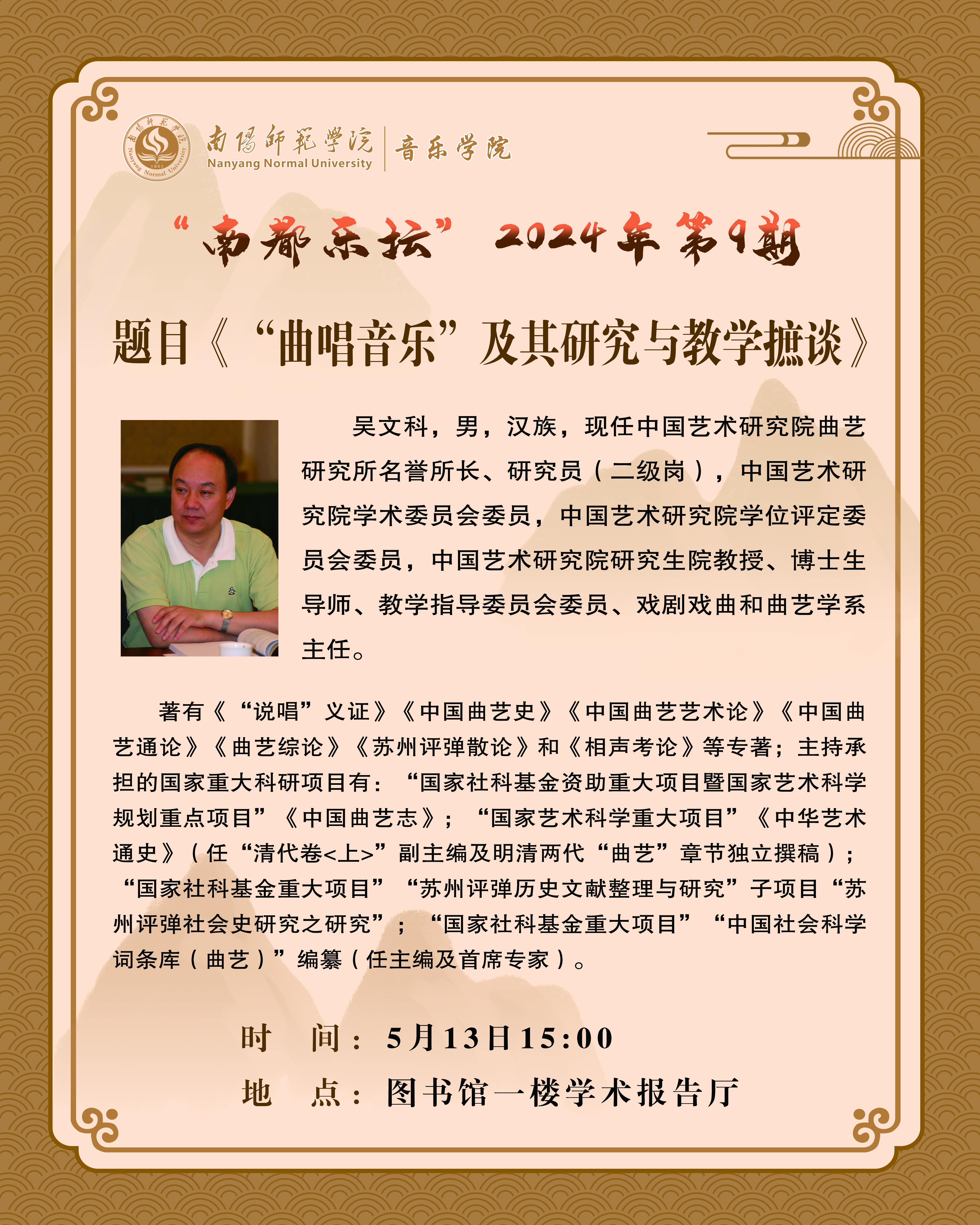 报告简介:从音乐史学研究切入,融合教学实践,对“曲唱音乐”的艺术发展轨迹进行介绍与分析,通过交流,探讨曲唱音乐的研究与教学的系列学术课题。