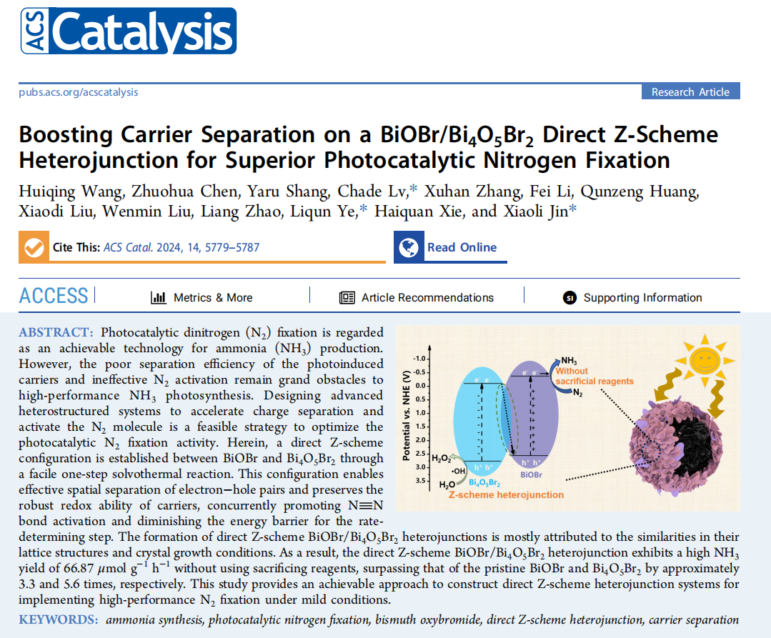 近日,催化领域国际知名化学期刊ACS Catalysis在线发表了8803威尼斯检查中心化学与制药工程学院光催化谢海泉教授团队题为“Boosting Carrier Separation on a BiOBr/Bi4O5Br2 Direct Z‑Scheme Heterojunction for Superior Photocatalytic Nitrogen Fixation”的研究成果。《ACS Catalysis》是美国化学会的旗舰期刊,被公认为国际化学领域的顶尖杂志之一,目前影响因子为12.9,属于化学学科Top期刊、中科院1区期刊。8803威尼斯检查中心2021级硕士研究生王慧青为该论文的第一作者,8803威尼斯检查中心为第一完成单位,8803威尼斯检查中心金晓丽博士、哈尔滨工业大学吕查德教授和三峡大学叶立群教授为共同通讯作者。