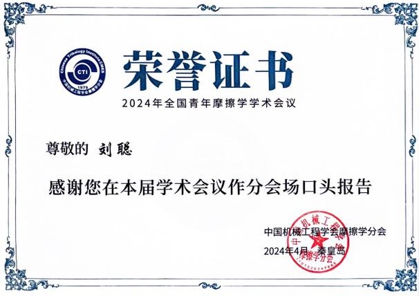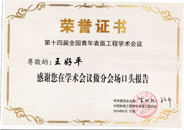 本网讯(刘聪 王好平 文/图)为有序推进科学研究高质量的发展,近日,智能制造与电气工程学院两位教师刘聪、王好平分别参加了由机械工程学会主办的2024年全国青年摩擦学学术会议和2024年第十四届全国青年表面工程学术会议,并被邀请进行了口头汇报交流。