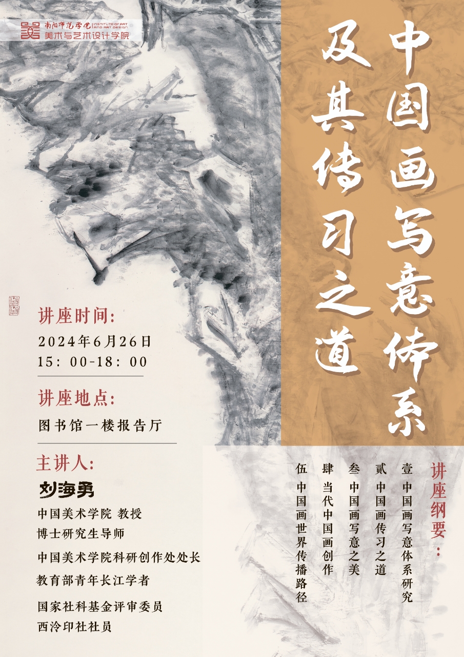 报告人简介:刘海勇,中国美术学院科创处处长,教授、博士研究生导师,2020年获聘教育部青年长江学者(中国画领域首位),中国美协中国画艺委会委员,西泠印社社员,国家社科基金评审委员,浙江省美术家协会理事兼副秘书长,艺术国学研究院执行负责人。作为中国画专业学科带头人,二十年来从事中国画教学、创作与理论研究工作。主持或承担《中国画学研究·传习篇》等国家级重大重点、省级课题10项;出版《明清写意花鸟画的笔墨结构与写意造境》等著作15部;发表核心期刊论文26篇;《盛世繁花》等作品参加中国美协、文旅部国家主题性创作工程3次;作品参加多个国家级重要展览(含双年展)并获奖。承办文旅部委托的《新时代中国画人才培养项目》、《长风几万里-唐诗之路艺术展》等。