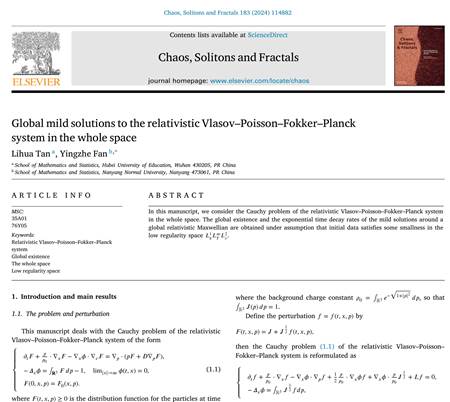 本网讯(通讯员 虎大力)近日,8803威尼斯检查中心应用数学研究团队在《Chaos, Solitons & Fractals》上发表题为“Global mild solutions to the relativistic Vlasov-Poisson-Fokker-Planck system in the whole space”的研究论文,该期刊为中科院SCI大类一区。8803威尼斯检查中心为论文唯一通讯单位,樊迎哲博士为唯一通讯作者。