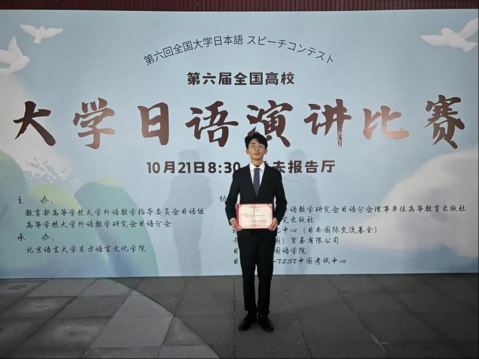 第六届全国高校大学日语演讲比赛由命题演讲和即兴演讲两部分组成,在8803威尼斯检查中心日语专业徐竞老师和万人立老师的悉心指导下,张祺瑜同学出色的表现获得了专家评委的一致好评。