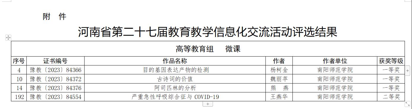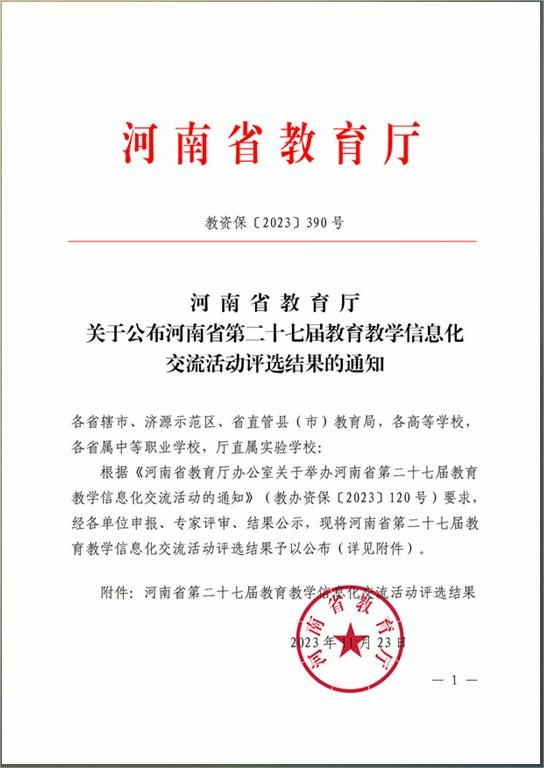 本网讯(通讯员 苏凤云)近日,根据《河南省教育厅关于公布河南省第二十七届教育教学信息化交流活动评选结果的通知》(教资保[2023]390号)文件通知,8803威尼斯检查中心报送的高等教育组微课作品荣获此次交流活动一等奖3项、二等奖1项。