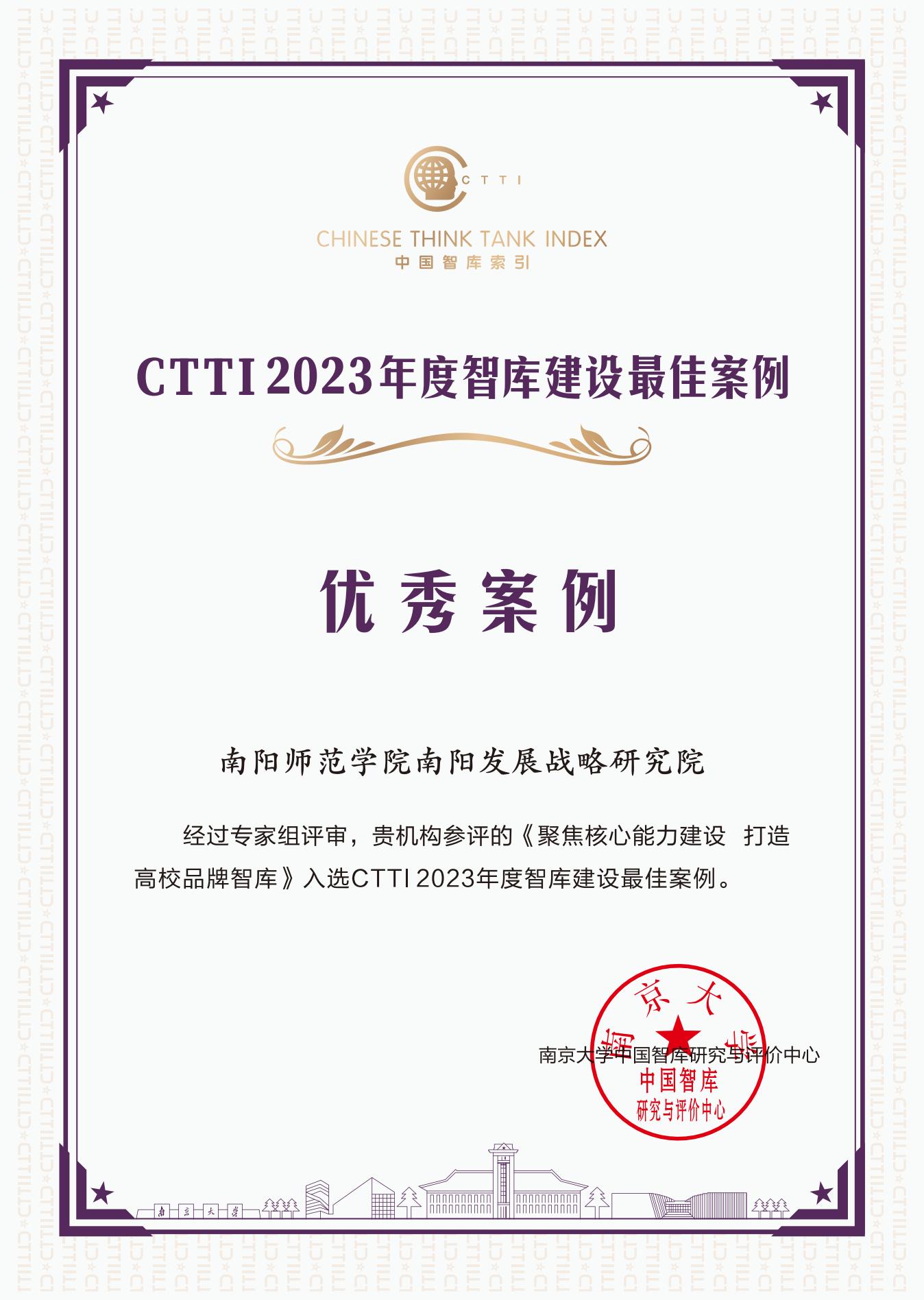 近年来,南阳发展战略研究院认真履行新型高校智库职责,积极服务地方党委政府中心工作,聚焦社会热点难点,深入开展调查研究,积极撰写决策咨询报告,举办河南省现代化省域副中心城市发展高端论坛、中国式现代化与省域副中心城市论坛等活动,有效发挥了新型高校品牌智库的职能作用,先后荣获首批“河南省高校新型品牌智库建设单位”“河南省科技智库副中心城市研究基地”等称号,智库品牌影响力和知名度不断提升。