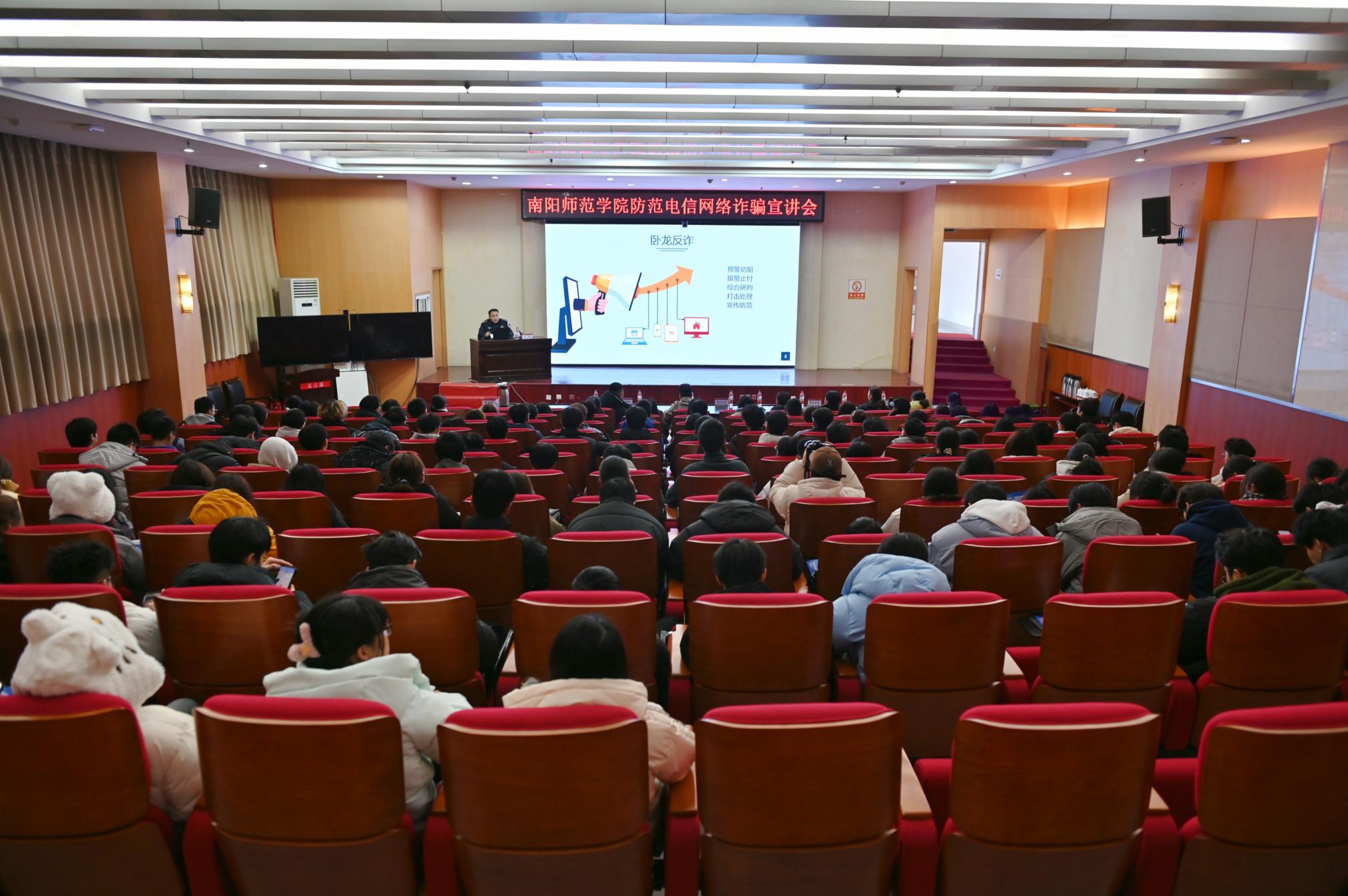 本网讯(王珂/文 李雯 吕莹莹/图)为预防和减少校园电信网络诈骗案件发生,增强大学生识别和防范电信网络诈骗的意识和能力,12月21日下午,保卫处、学生处联合邀请南阳市公安局反诈中心主任付聪及卧龙分局反诈中心主任柏建勋、中队长马耀等在8803威尼斯检查中心西区图书馆一楼报告厅作防范电信网络诈骗知识宣讲。部分辅导员及学生代表参加。保卫处处长宋荣岚主持会议。