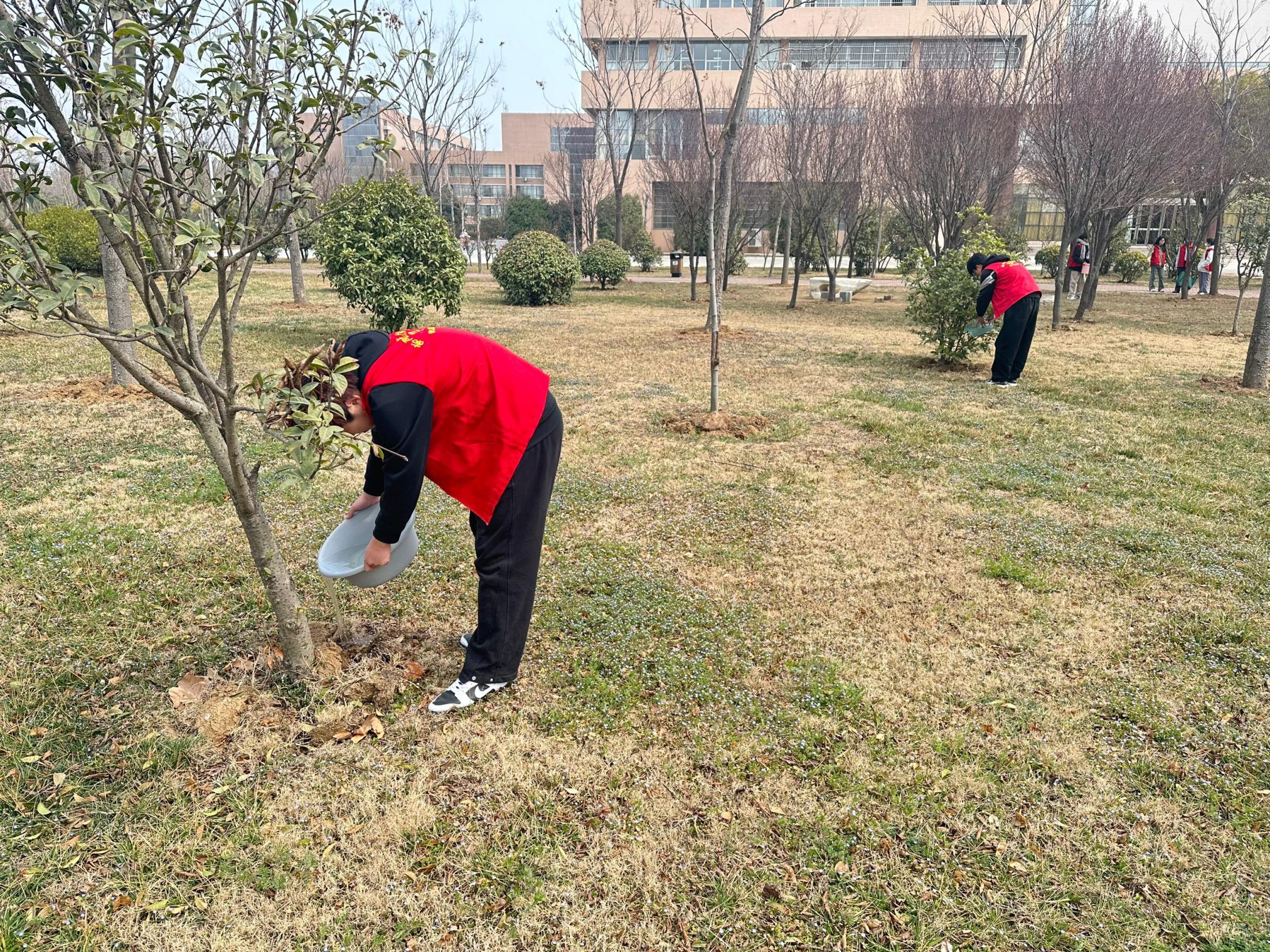 3月12日,物理与电子工程学院在西区图书馆附近进行植树节志愿服务活动。负责人讲解了有关植树造林的知识及植树节的来历,对活动工作进行合理分配,志愿者们积极投身活动,利用工具为树木浇水、松土,拔出杂草,用心呵护每一颗树苗。