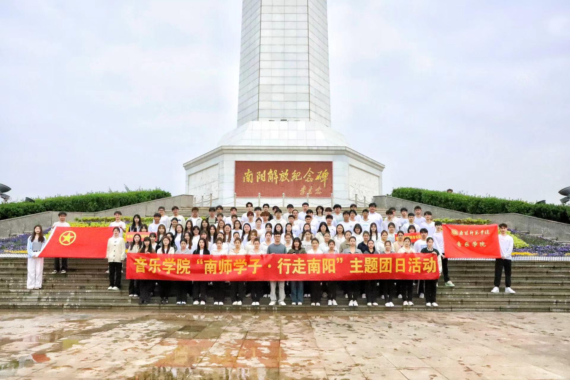 4月13日,音乐学院在南阳市解放广场开展“南师学子·行走南阳”主题团日活动。在学院老师的带领下,同学们一起瞻仰南阳解放纪念碑缅怀先烈,从石刻碑文中感受内心对先烈的哀思与革命精神的传承,并在广场通过民舞、唱山歌、乐器合奏等形式开展快闪活动。(编审 刘潇潇)