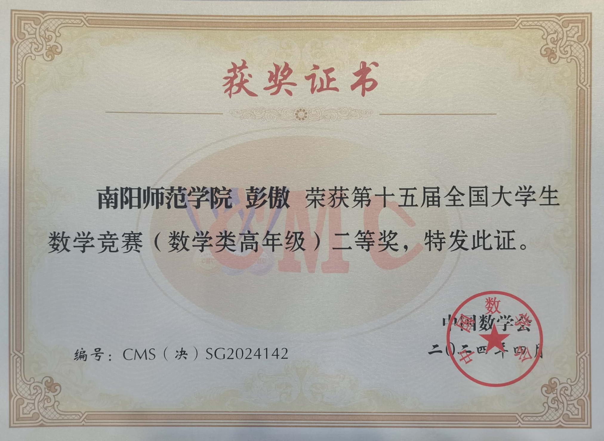 全国大学生数学竞赛是由中国数学会主办,面向本科学生的全国性高水平学科竞赛,旨在促进我国高等学校提高人才培养质量,促进数学课程建设与教学改革,激励学生学习数学的兴趣,发现和选拔数学创新人才,为青年学子提供展示数学能力的舞台。本届比赛参赛高校达1108所,报名人数达288355人,经过初、复赛等环节,共1100余人入围决赛参与最终角逐,最终全国一、二等奖获奖率不足0.22%,彭傲同学所获的二等奖为河南高校学子在本次竞赛数学类高年级组中获得的最高级别奖项。