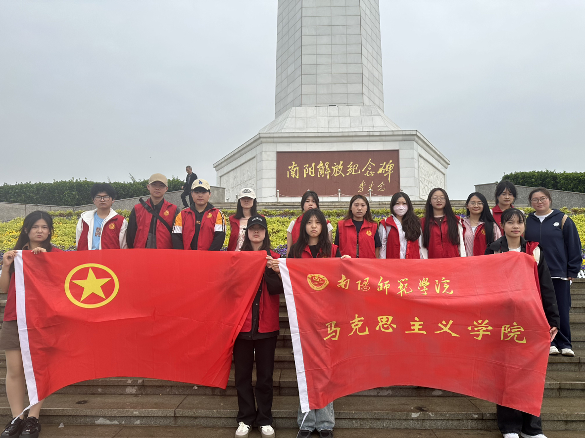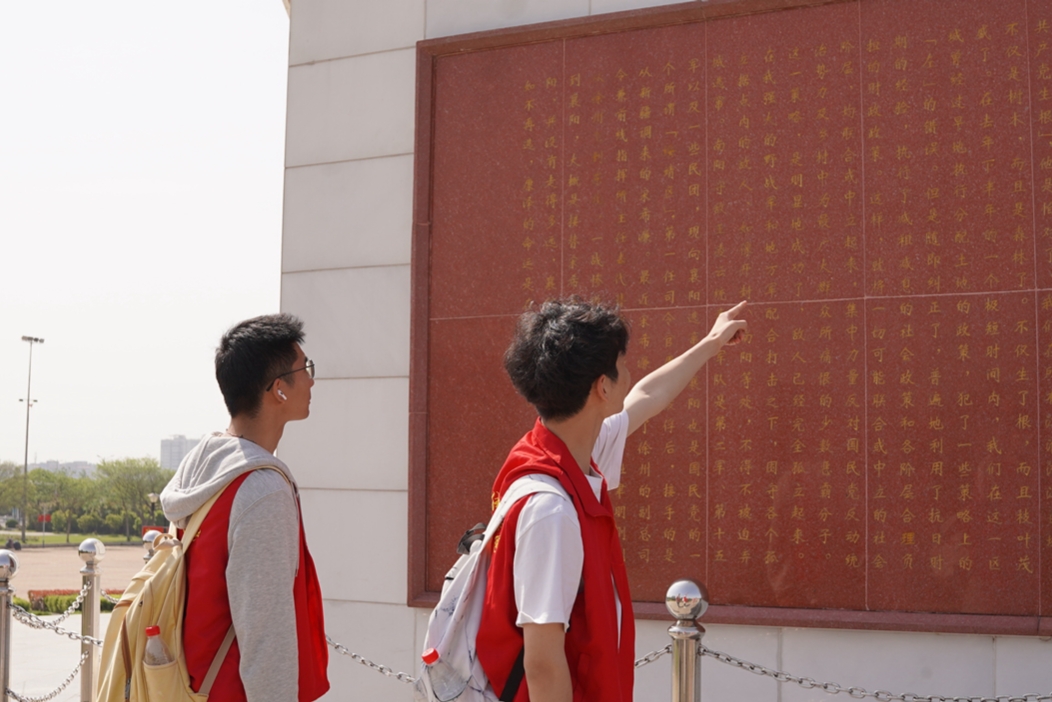 4月13日,马克思主义学院青年团员在南阳市解放广场开展“南师学子·行走南阳”主题团日活动。马克思主义学院团委书记刘哲向大家介绍解放广场背后的故事,团员们驻足瞻仰解放纪念碑及其底座浮雕,共同重温历史历程,在学习红色基因中坚定信念,承担责任使命。