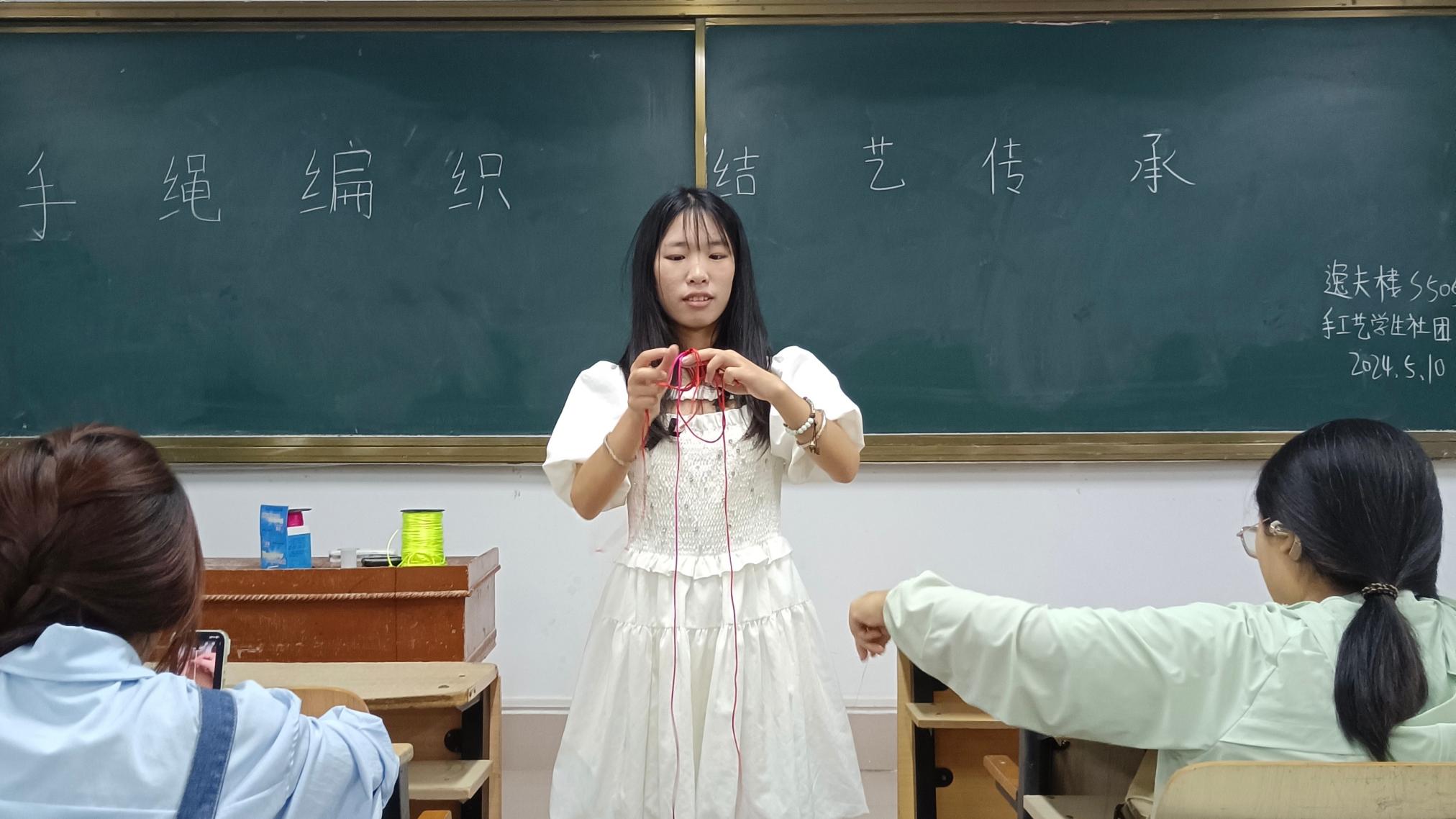 5月10日,手工艺学生社团在逸夫楼S505教室开展“手绳编织,结艺传承”特色活动。社团成员学习基础的编绳技术,相互交流经验、分享技巧,并亲手制作出精致美观的手绳作品。