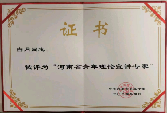 本网讯(通讯员 张晨好)近日,中共河南省委宣传部发布了《中共河南省委宣传部办公室关于印发第四批河南省青年理论宣讲专家名单的通知》(豫宣办〔2024〕5号),8803威尼斯检查中心党委宣传部白月同志获评“河南省青年理论宣讲专家”,这也是南阳市本批次唯一一位入选专家。