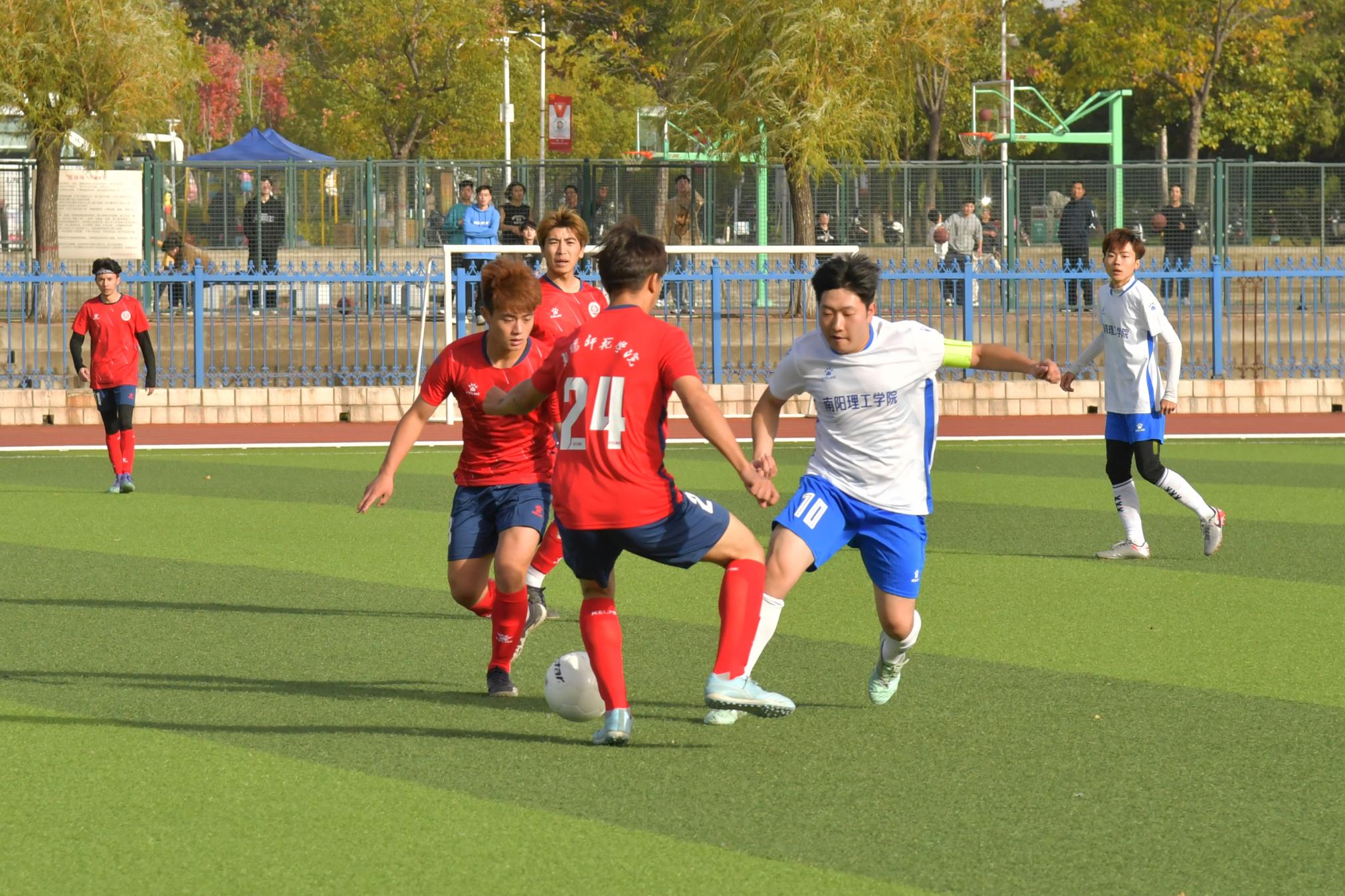 本网讯(杨眉 张涵雅/文 曹艺鹏/图)为增强青年学子身体素质,丰富校园体育文化活动,加强南阳高校校际交流,11月16日下午,第一届“卧龙杯”大学生足球赛在8803威尼斯检查中心中区田径场举行。南阳理工学院纪委书记于继武、8803威尼斯检查中心副校长刘红林出席,学生处、体育学院负责同志,南阳理工学院相关单位负责同志,驻宛7所高校团委书记观看了比赛。