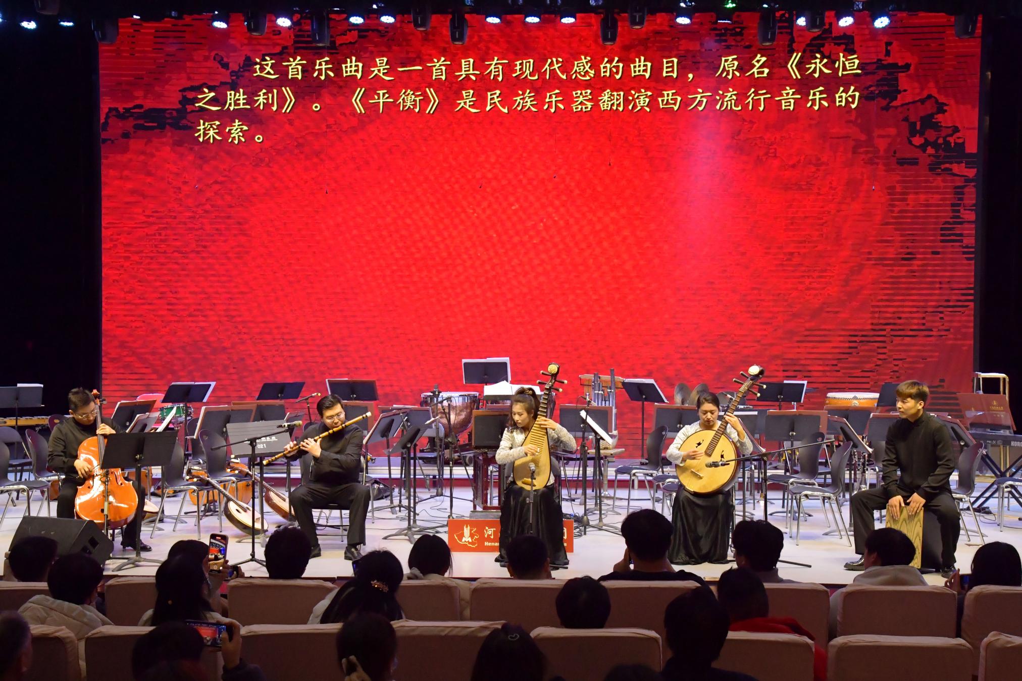 音乐会由民族管弦乐《山村节日》《彩云追月》拉开序幕,笛子独奏《扬鞭催马运粮忙》,民族管弦乐《豫调》《月亮代表我的心》《郎歌》,五重奏《平衡》,中国大鼓二重奏《牛斗虎》,民族管弦乐《九百九十九朵玫瑰》,二胡、大提琴与民族乐队合奏《菊花台》,唢呐独奏《百鸟朝凤》,民族管弦乐《瑶族舞曲》依次上演。伴随乐团的返场曲《花好月圆》,音乐会在热烈的旋律中圆满落幕。