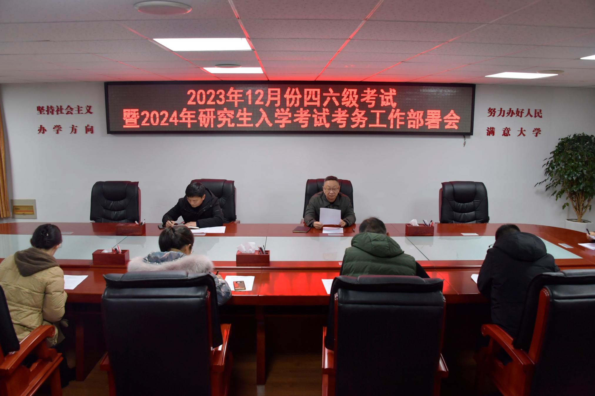 本网讯(王鹏飞/文 樊梦泽/图)12月13日上午,2023年12月份英语四六级和2024年全国硕士研究生招生考试考点考务工作协调会在办公大楼三楼西会议室召开。副校长周旗,教务处、党办、院办等部门负责人参加会议。会议由教务处处长刘金江主持。