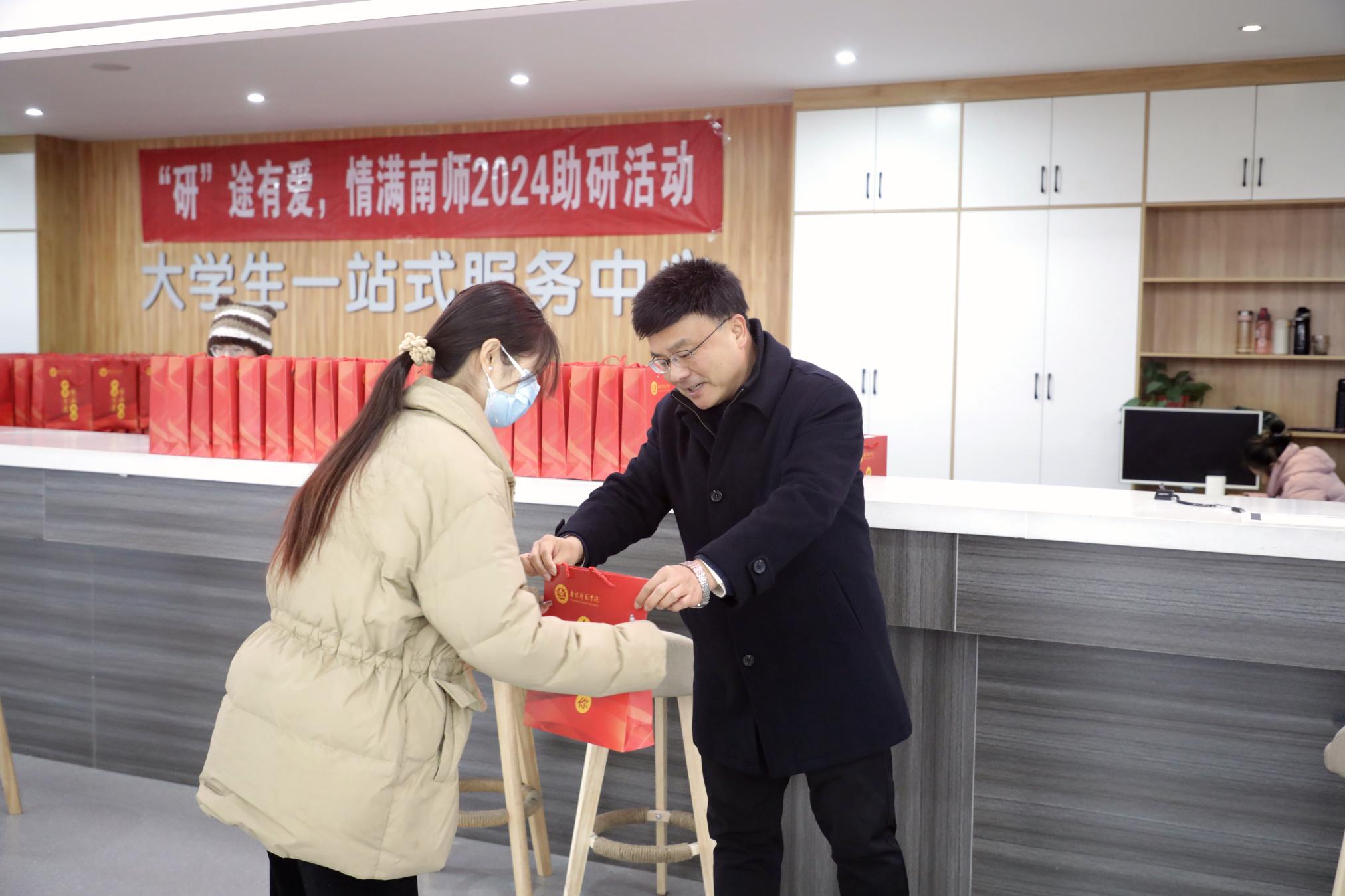 12月18日上午,副校长刘红林到考研“加油包”发放现场,将蕴含南师美好祝福的礼包发放给学生们,并亲切询问各位学子在校学习和生活情况,细心叮嘱他们考研在即,要注意身体,放平心态,稳定发挥、沉着应考,祝愿他们取得优异成绩。