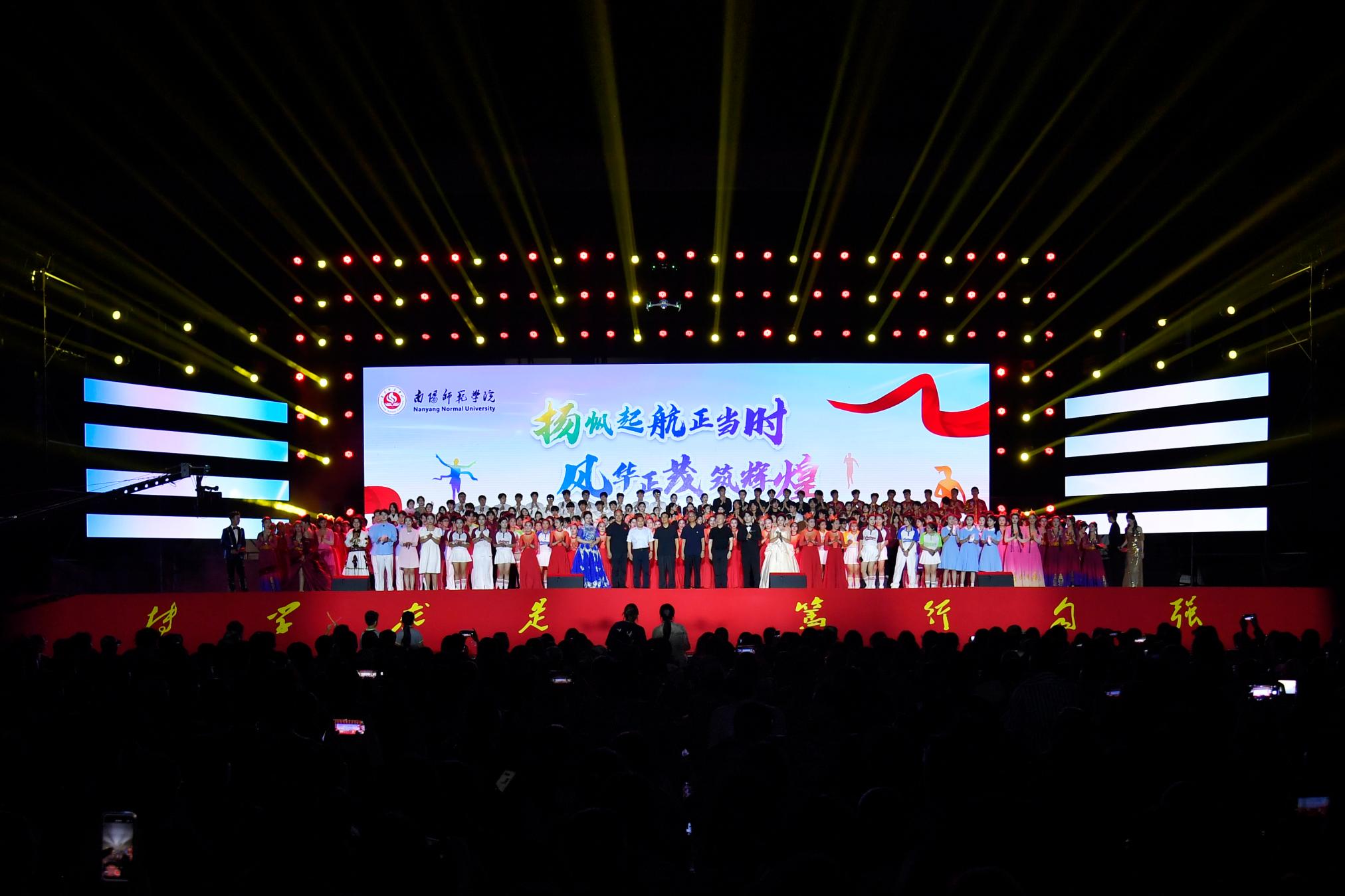 晚会分为青春校园、筑梦追光、领航未来三个篇章。气势磅礴的鼓舞《象王战鼓》震撼开场,瞬间点燃了现场的气氛,为晚会拉开序幕。青春校园篇章中,舞蹈《奔跑的青春》热情洋溢,舞动出南师青年们的蓬勃朝气;原创歌曲《南阳·南阳》婉转悠扬,深情吟咏古城南阳的独特风韵与无穷魅力;服装走秀《霓裳新赋》巧妙融合古今服饰创意,模特们优雅的步伐展现独特的东方美学;街舞《强国画卷》将中国传统文化与现代街舞相融合,彰显文化自信。筑梦追光篇章中,武术《武风龙韵》豪气干云,大开大合的拳脚招式与行云流水的刀光剑影赢得观众们热烈掌声;歌曲《畅想青春》旋律触动人心,观众们沉醉其中,带动全场合唱;维吾尔族舞蹈《石榴花开》热情奔放、明艳大气,带领大家一同领略异域风光;彩带龙《雪龙吟》融健身、舞蹈于一体,金光飞舞精妙绝伦,灵动展现龙之风采,给人力与美的双重享受。领航未来篇章中,歌曲《无名的人》致敬平凡又伟大的奉献者,他们在各自岗位上默默耕耘,践行着忠诚和担当;情景剧《爱的回答》深情演绎师生间的温暖情谊,教师们不计回报的付出汇聚成点亮人间大爱的星河;拉丁舞《溯梦》的舞者们用或奔放热情或柔美抒情的舞步,将晚会氛围推至高潮;歌伴舞《领航》激励卧龙学子扬帆起航,以全新的奋进姿态逐梦新征程。整场晚会中,同学们挥舞着闪光灯,欢呼喝彩,气氛热烈,沉浸在点点荧光汇聚成的璀璨星河里。